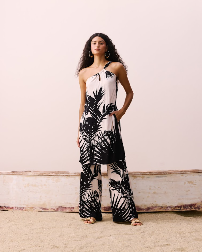 The elegant model has printed wide leg pants with side pockets and a crossover waistband .