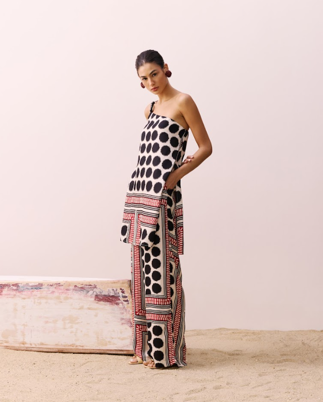 The elegant model has printed wide leg pants with side pockets and a crossover waistband .