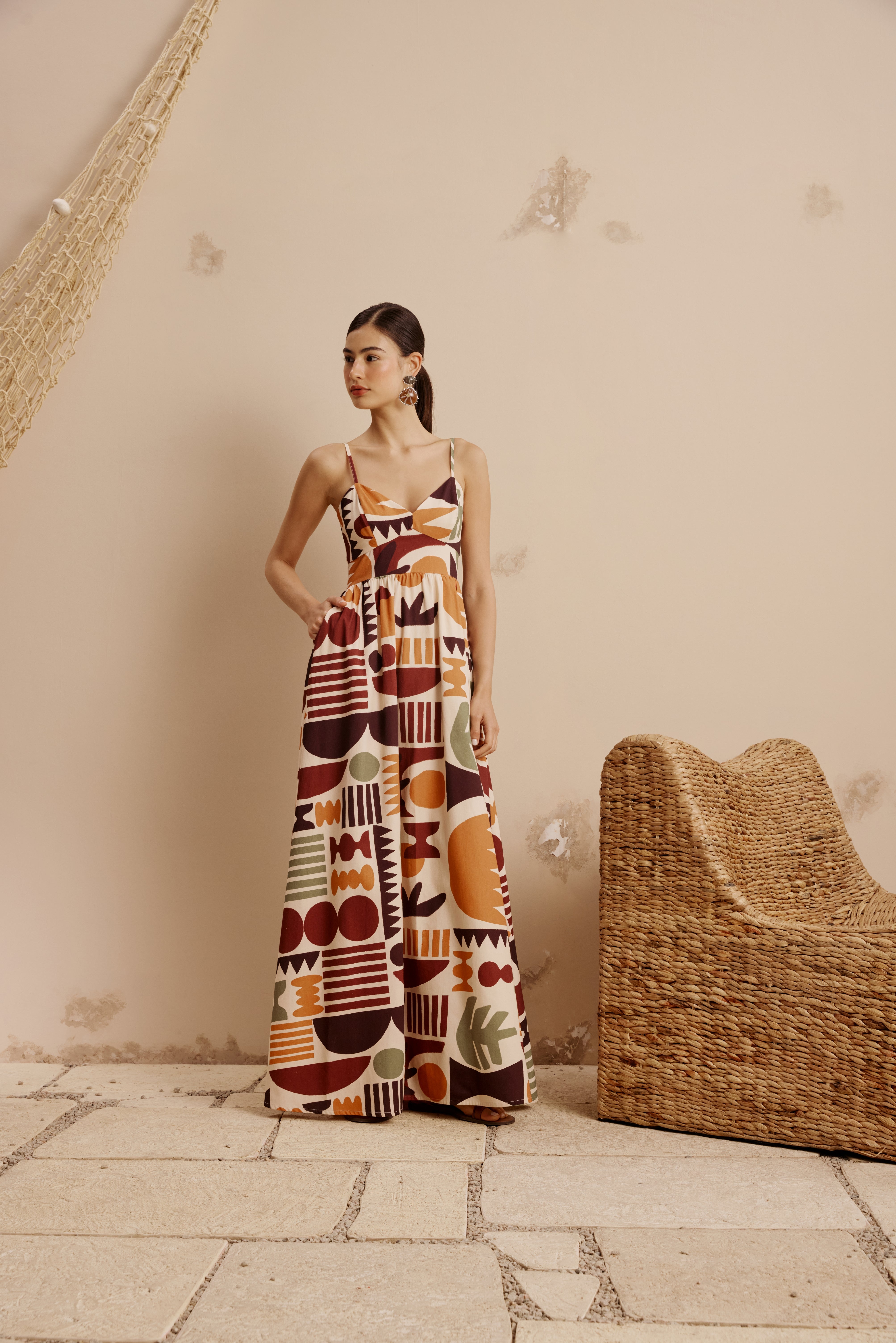 This Ample long dress features a soft scoop neckline that adds femininity while keeping the look relaxed and easy. The thin, delicate straps enhance the airy feel and highlight the shoulders, giving the piece a light, summery elegance. Combined with its flowing silhouette and bold earthy print, it delivers an effortless yet striking warm-weather style.