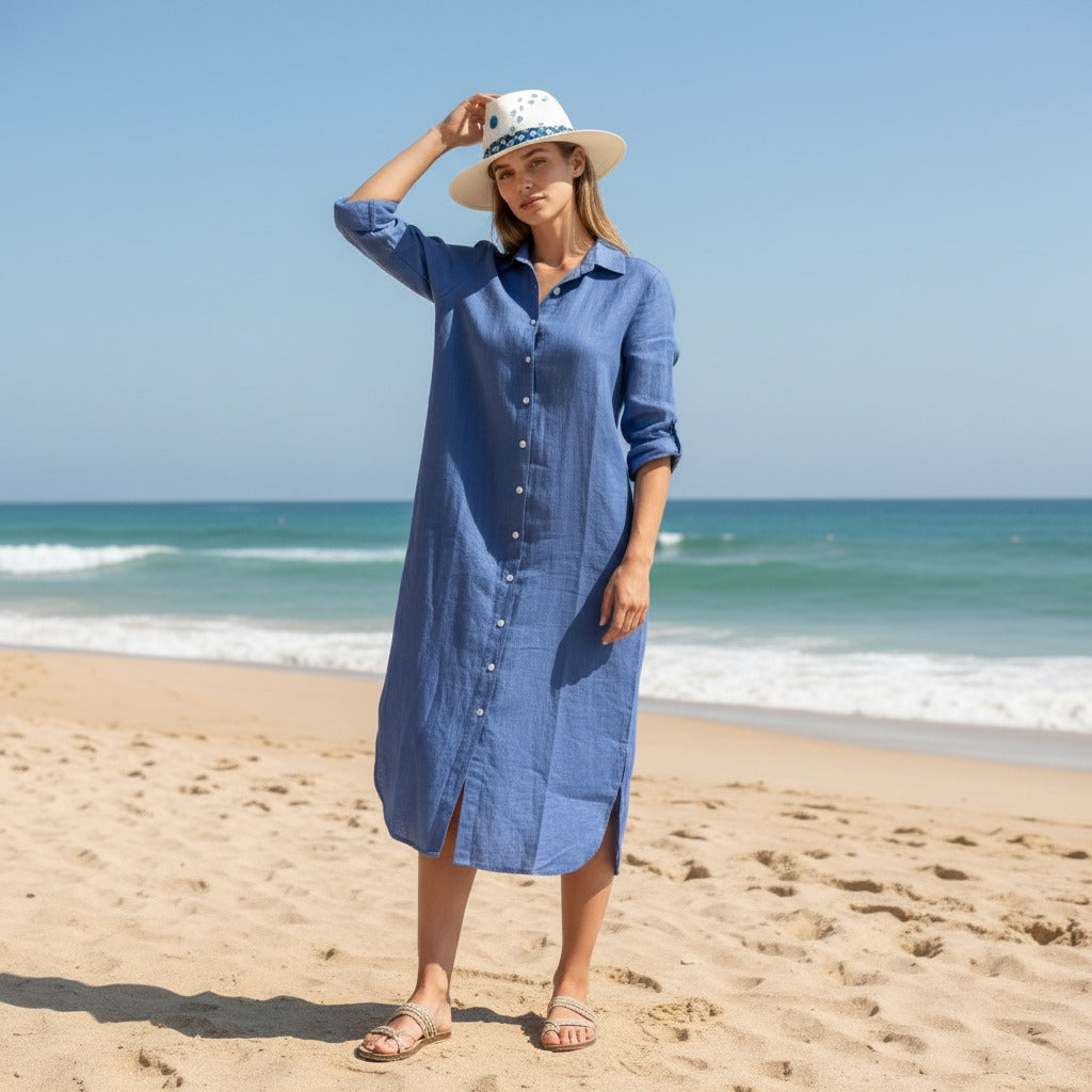 Long-sleeve linen dress crafted from breathable, lightweight fabric. Features a relaxed, flowy silhouette perfect for effortless everyday elegance and warm-weather comfort.