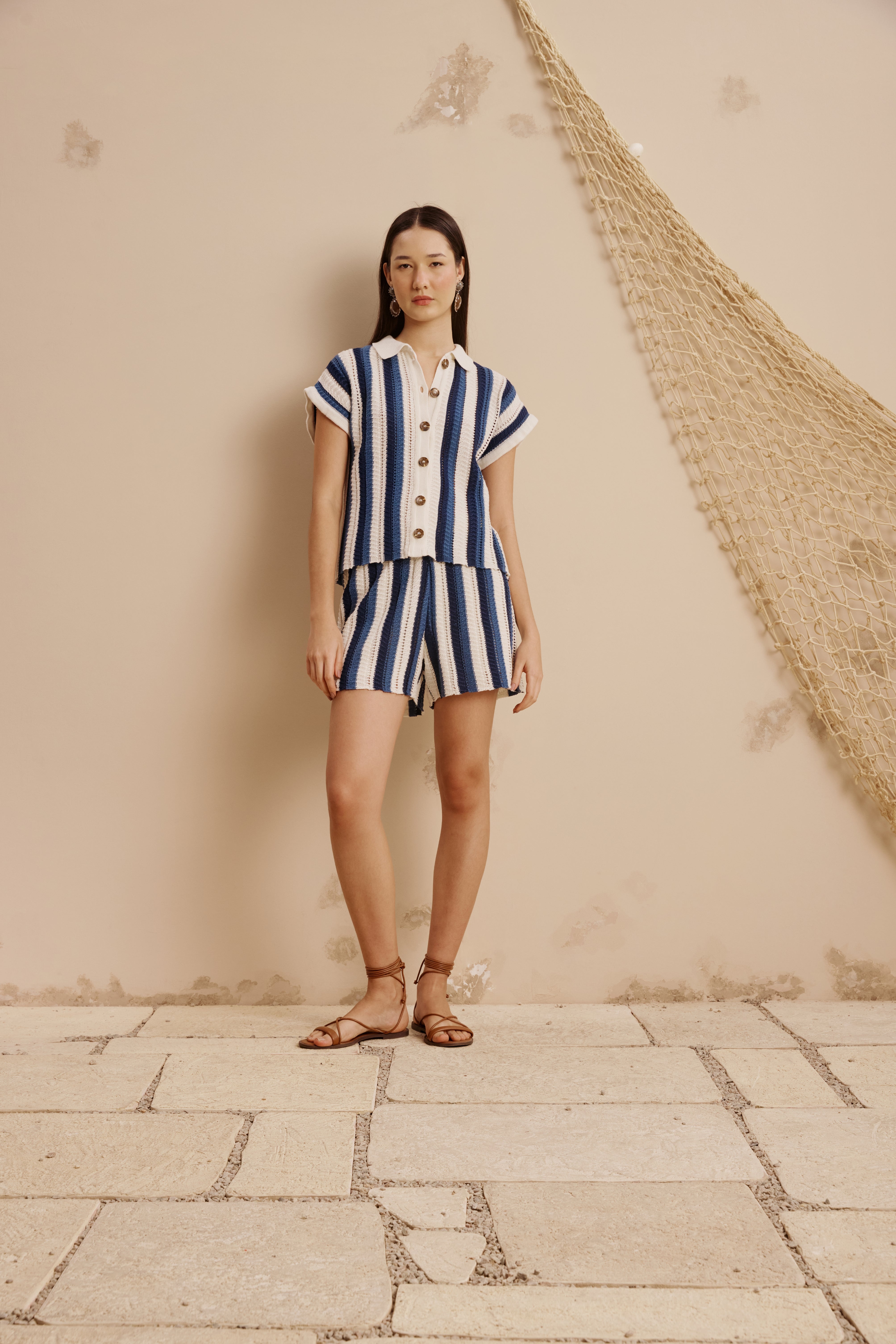 This CaCay knit fabric striped shirt features a textured openwork knit with vertical blue and white stripes that elongate the silhouette. Designed with a classic collar, button-down front, and rolled short sleeves, it blends structure with a soft, comfortable feel. The refined knit pattern and polished finish make it an elevated take on a casual staple.