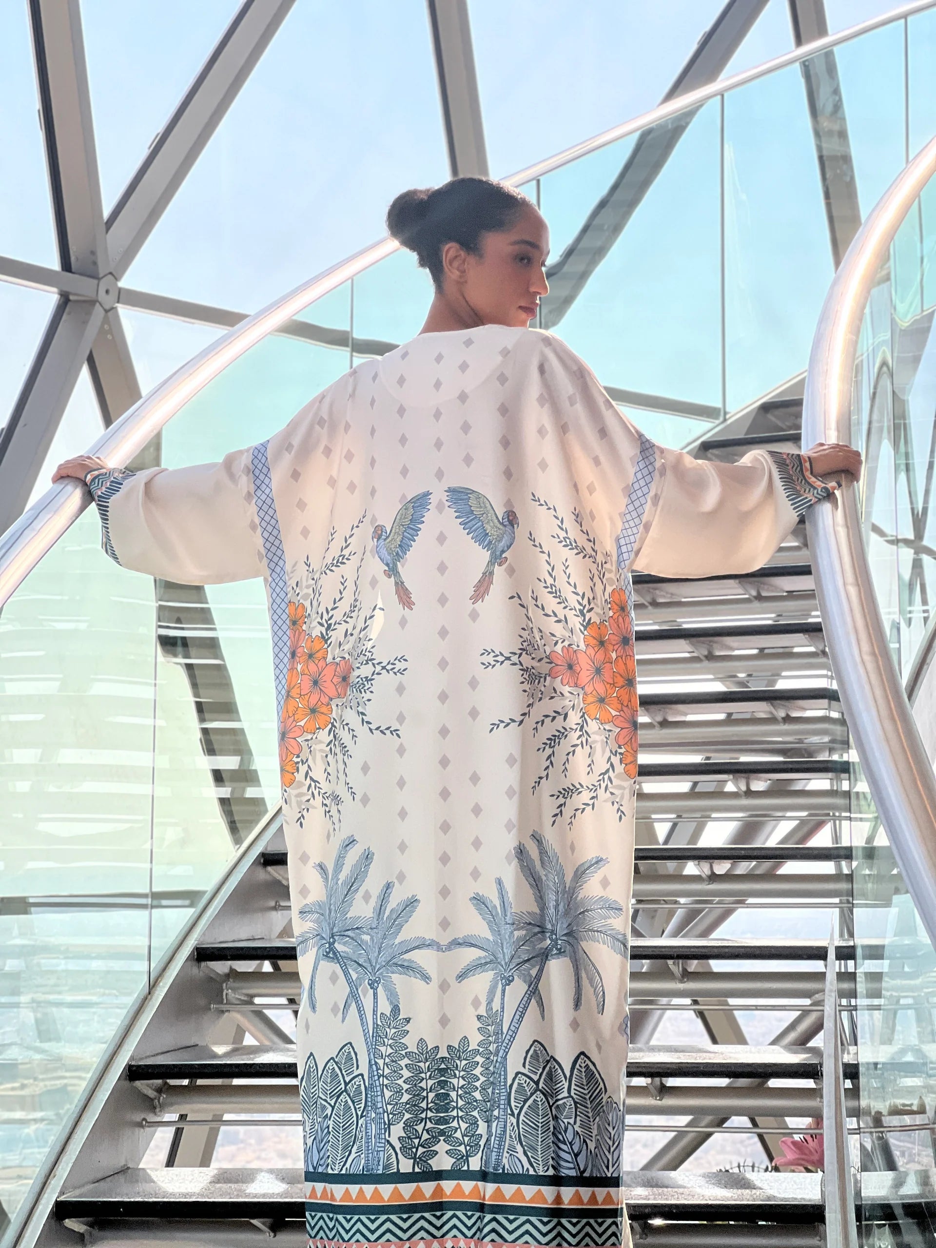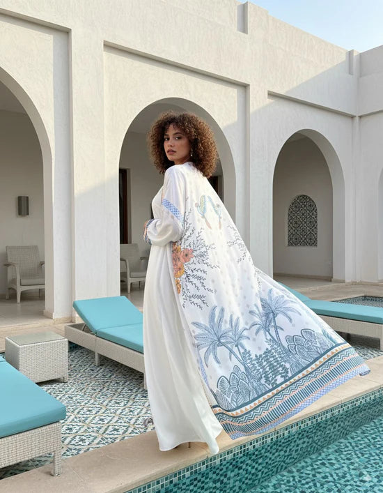 Last Seen in Capri recalls warm air and quiet pools, white fabric brushed with sketches of gardens, skies, and soft flight.