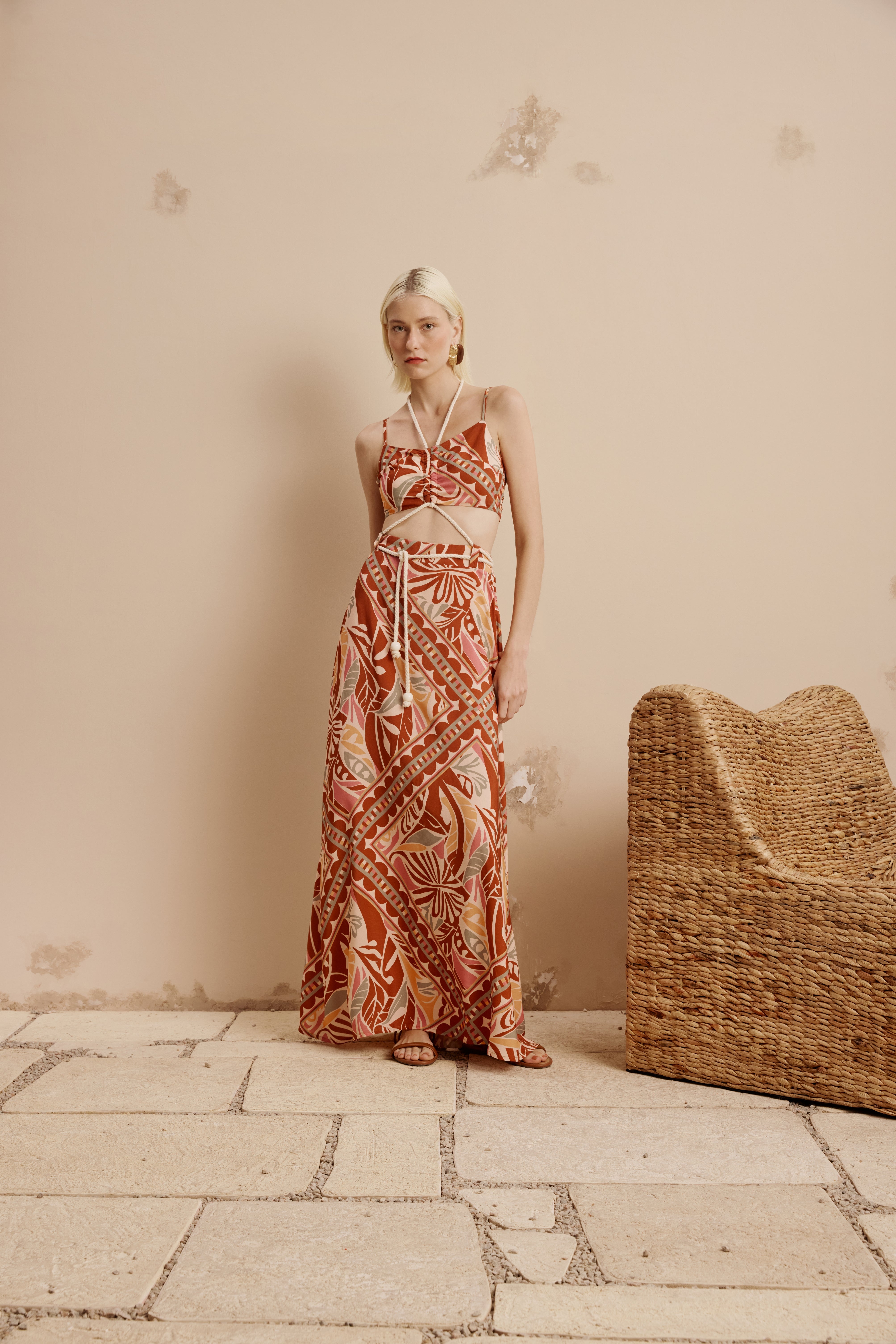 This long CaCay dress features strategic front cutouts that highlight the waist while maintaining an elegant, elongated silhouette. The bodice includes delicate thin straps and a twisted front detail that adds shape and visual interest. With its fluid drape and rich earthy print, the dress delivers a refined yet modern resort-ready look.