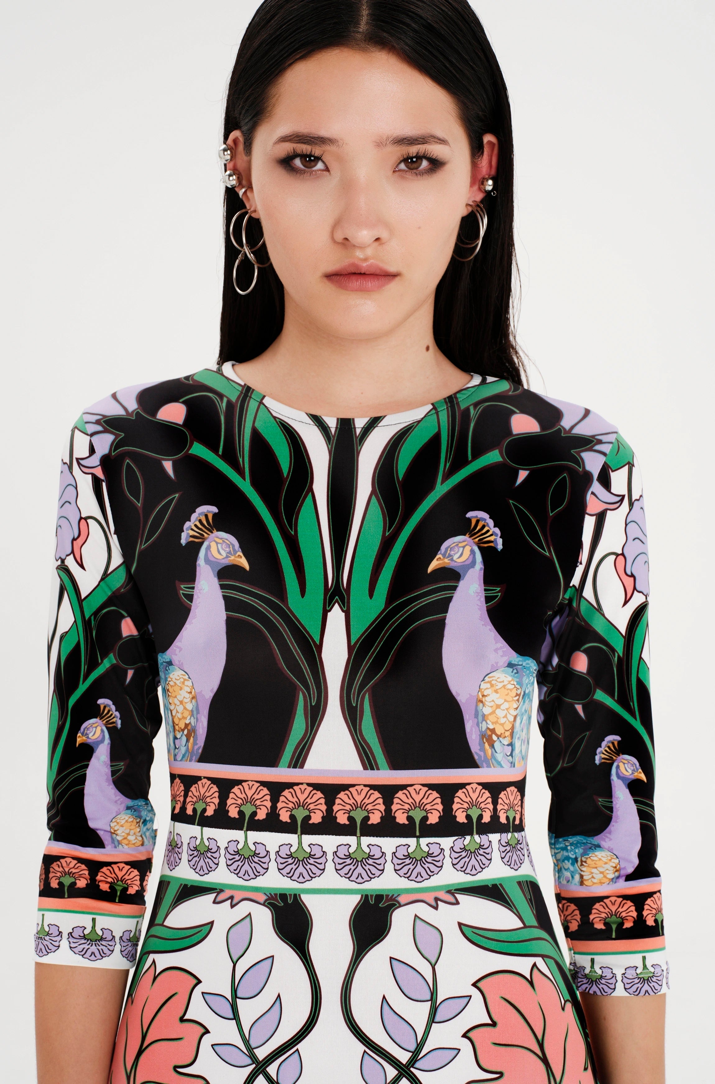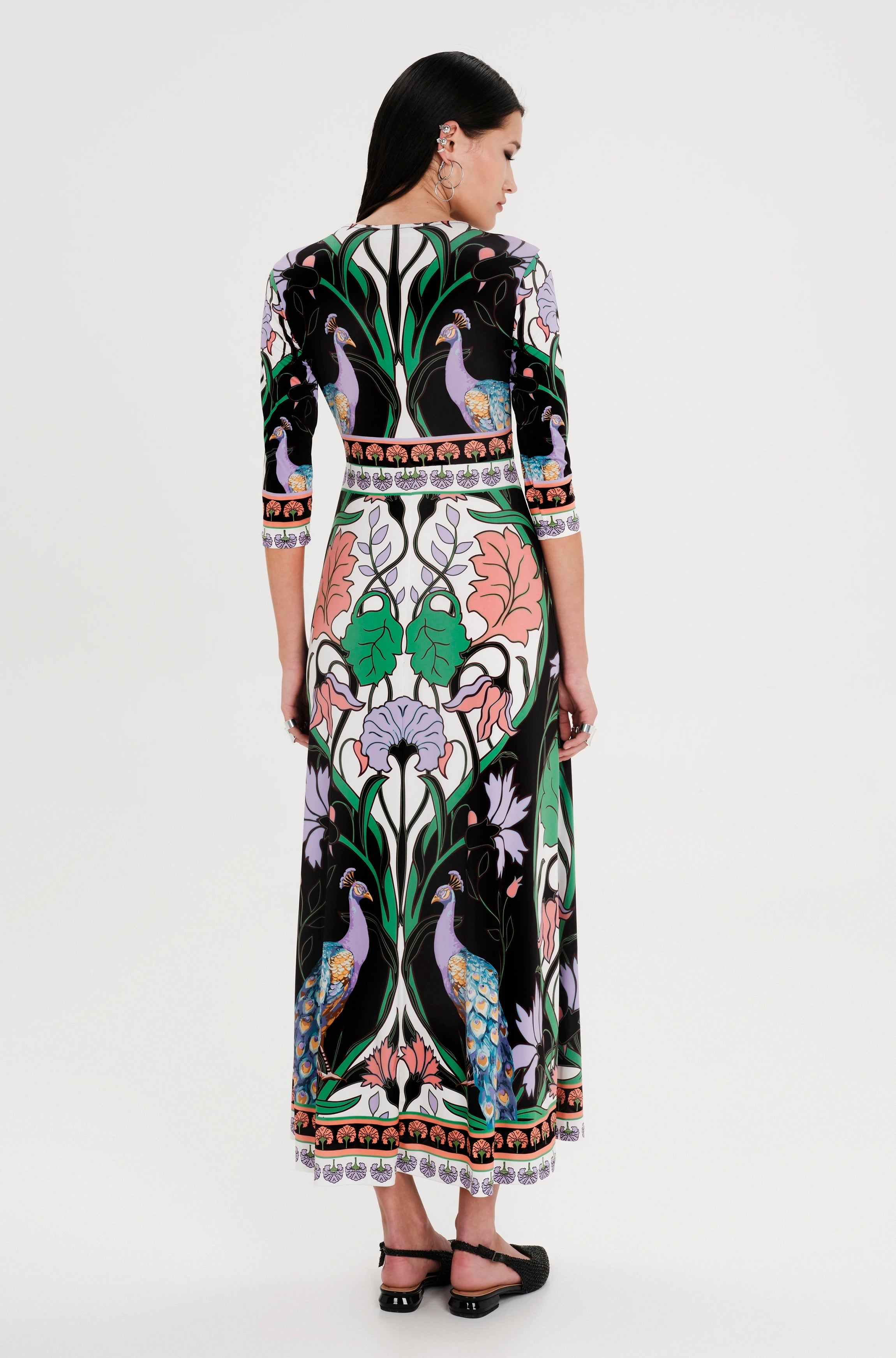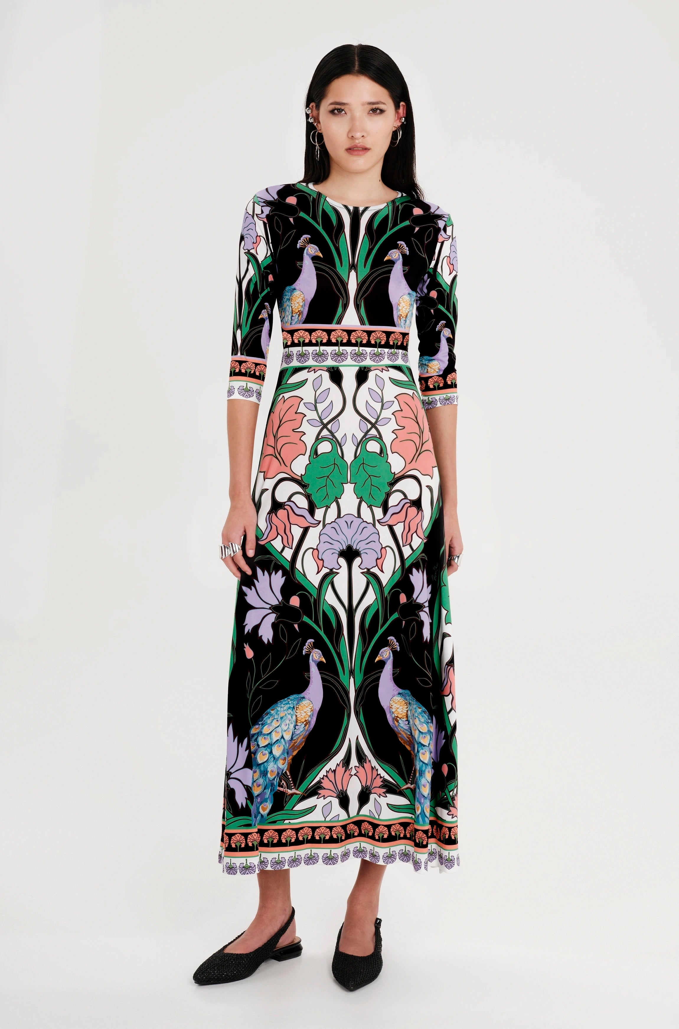 Our Nostalgia Maxi Dress showcases a signature P+C silhouette in smooth stretch jersey, fitted at the waist and flowing into a graceful A-line skirt. Designed with elegant ¾ sleeves, it features a beautifully placed print with symbolic peacocks in a vibrant paradise-inspired colour palette—perfect for daytime occasions, summer evenings, or whenever you want to shine with effortless confidence.