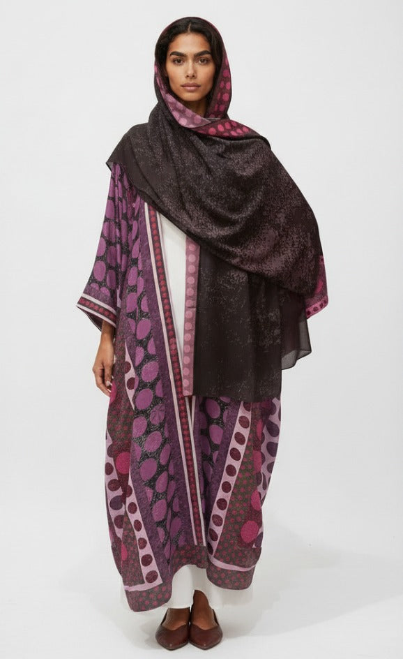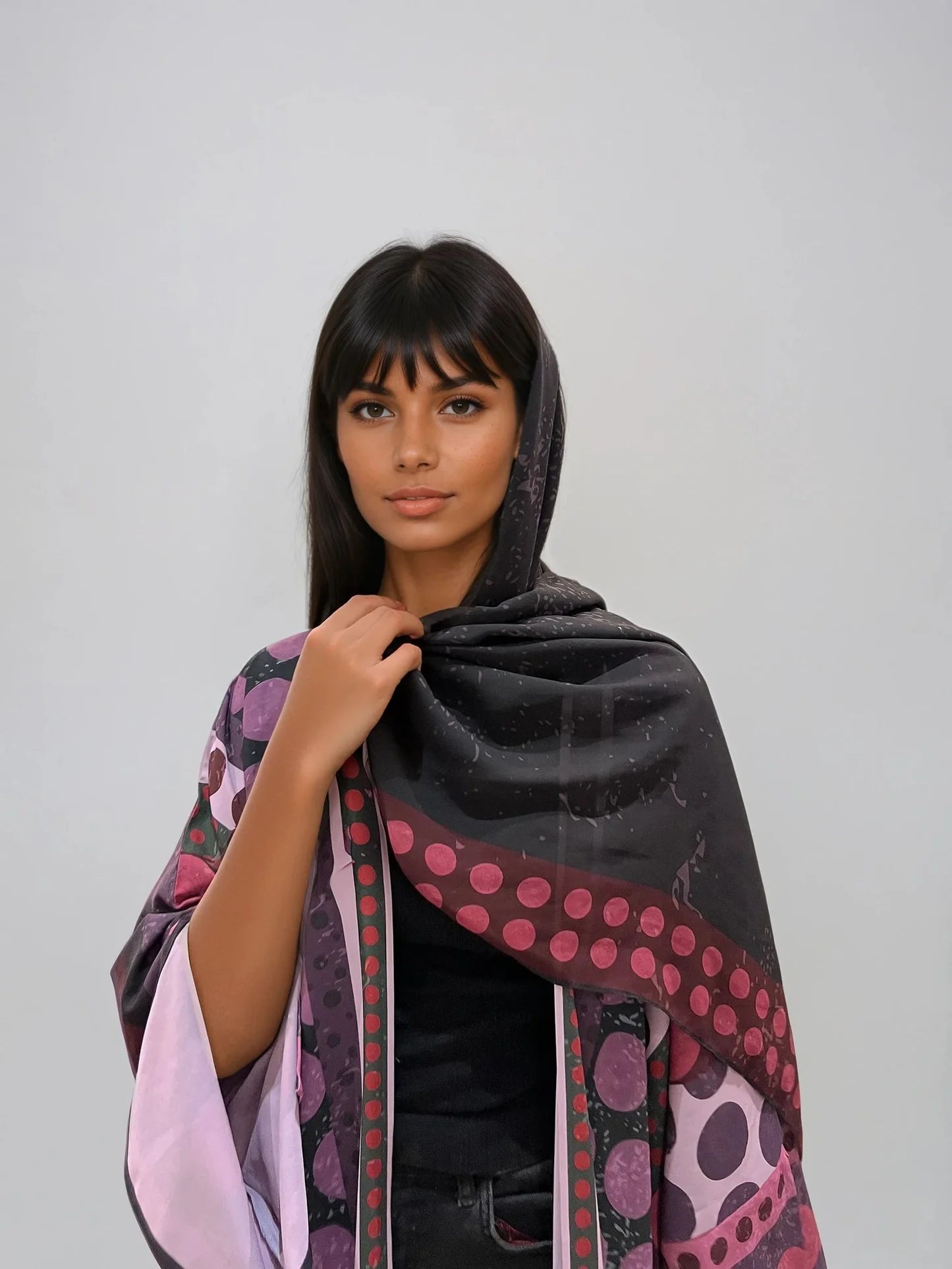 A versatile scarf for abaya styling, offering a soft, airy texture and graceful drape. Its subtle sheen and fluid fabric ensure both comfort and elegance, making it an essential accessory for polished, refined looks.