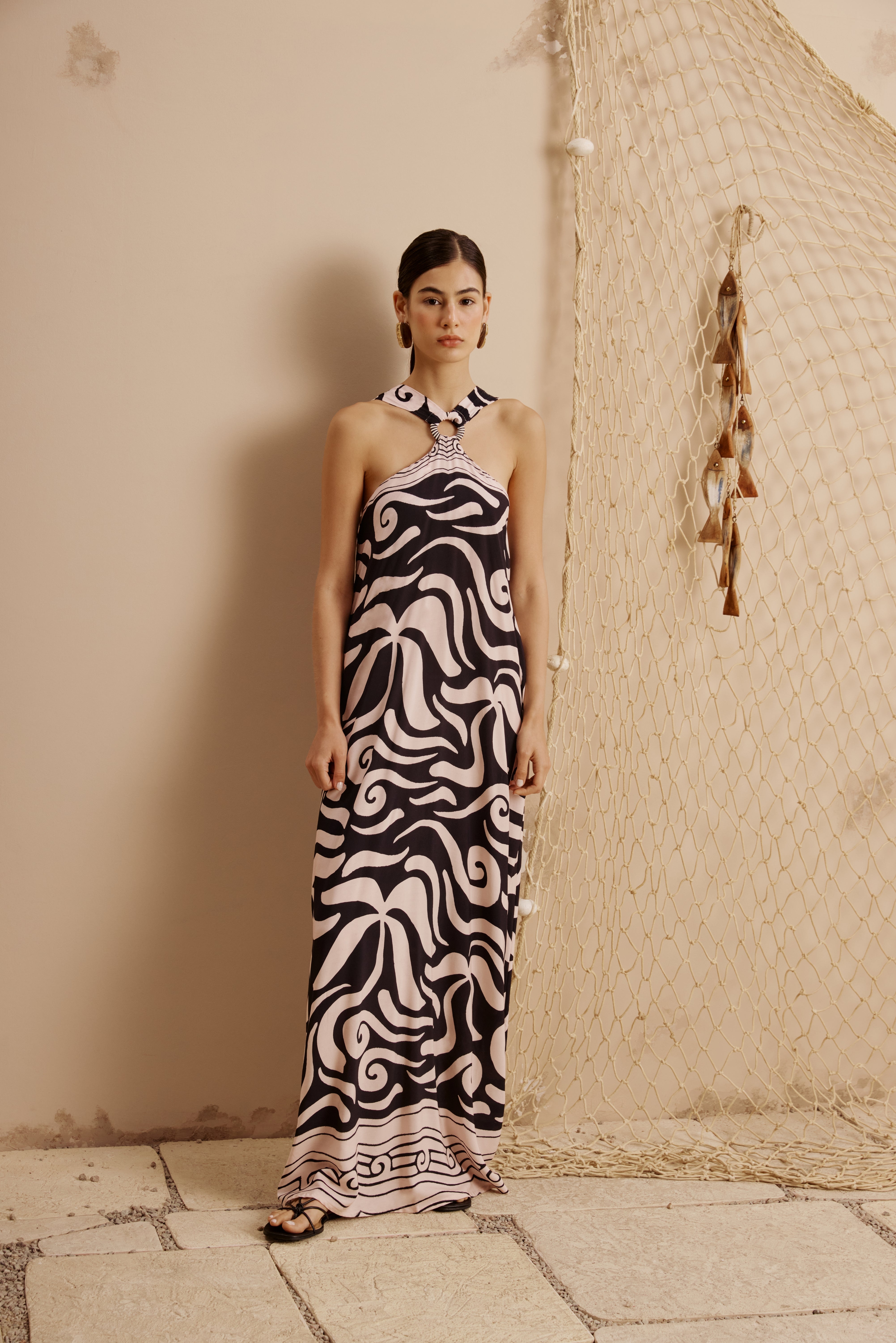 The CaCay Long Dress with Ring Neckline and Pororoca Print blends lightness with timeless elegance. Its fluid fit flatters without clinging, while the ring-and-rope neckline adds a modern touch and the wave-inspired print brings movement. Finished with a delicate back tie, it’s perfect for outdoor events or seaside moments.
