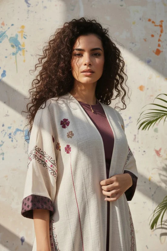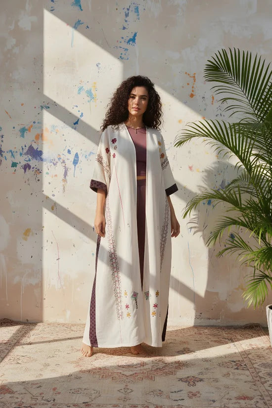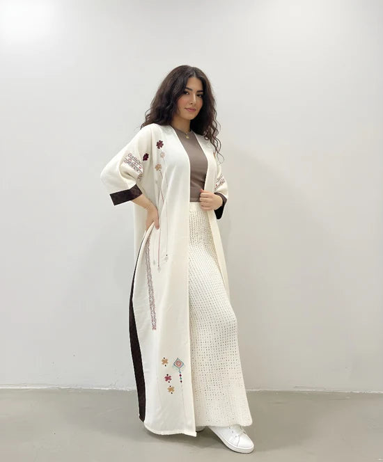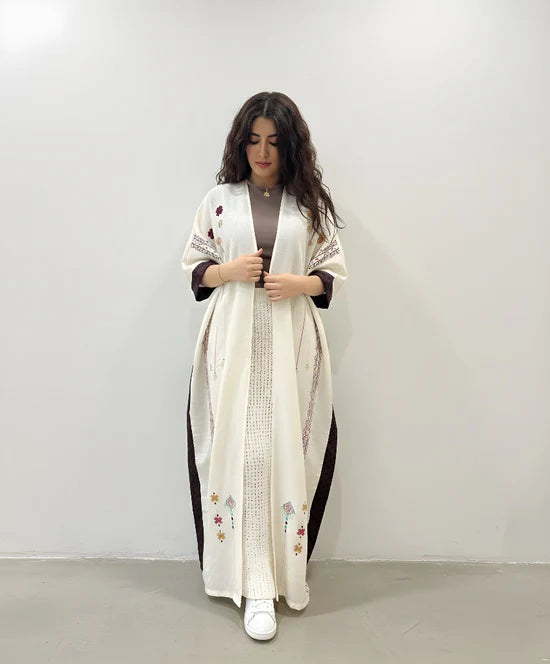Dreamcatcher motifs reimagined in embroidery, turning movement into pattern and presence. Created as a symbolic design, the abaya carries meaning with every detail.