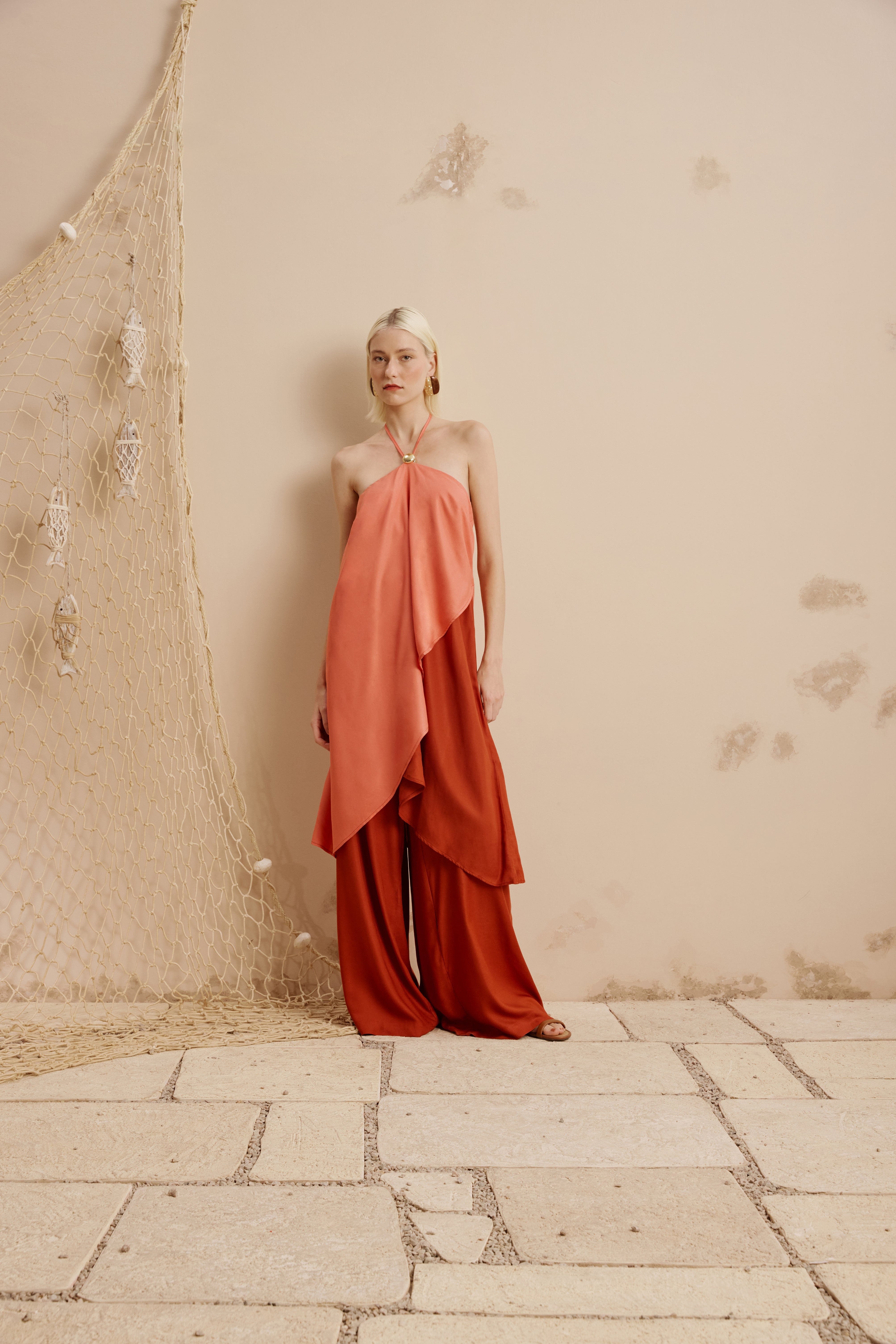 This elegant two-toned vest from Cacay blends effortless sophistication with contemporary design. Crafted with fluid, lightweight fabric, it features a halter neckline accented by a refined metallic ring detail, creating a striking focal point at the front.